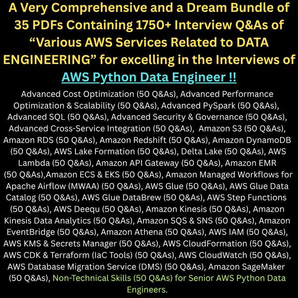 A Very Comprehensive and a DREAM Bundle of 35 PDFs Containing 1750+ Interview Q&As of "AWS Services Related to DATA ENGINEERING" for AWS Python Data Engineer Interviews !!Ace Interviews